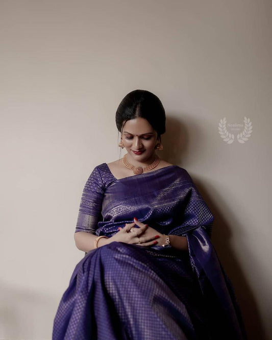 Adoring Navy Blue Soft Banarasi Silk Saree With Brood Blouse Piece
