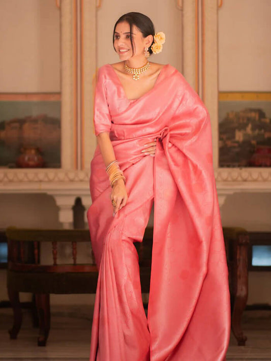 Breathtaking Pink Soft Banarasi Silk Saree With Bewitching Blouse Piece