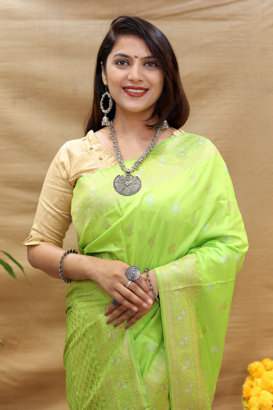 Blissful Parrot Soft Banarasi Silk Saree With Angelic Blouse Piece