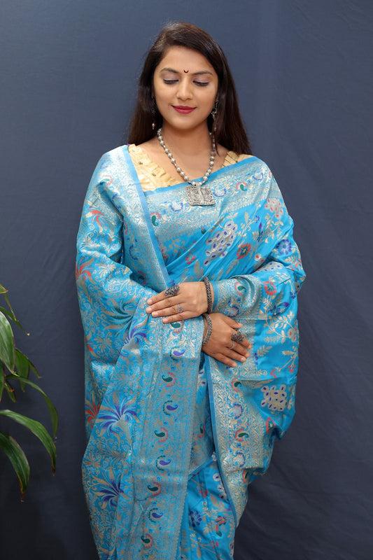 Effulgent Sky Soft Silk Banarasi Saree With Proficient Blouse Piece