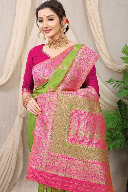 Prodigal Mehndi Banarasi Silk Saree With Redolent Blouse Piece