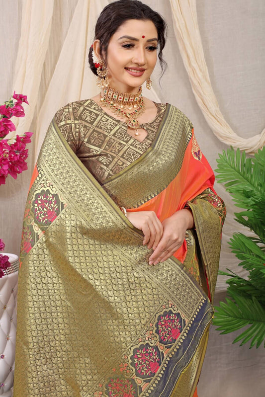 Lissome Peach Kanjivaram Silk With Sizzling Blouse Piece