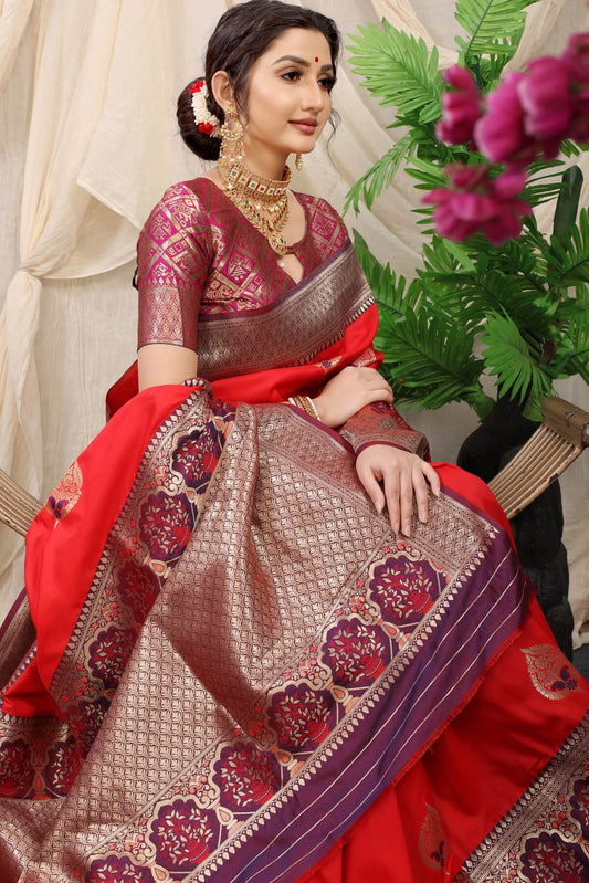 Ailurophile Red Kanjivaram Silk With A glam Blouse Piece