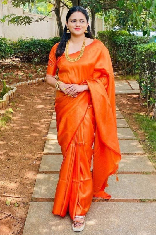 Brood Orange Kanjivaram Silk Saree With Diaphanous Blouse Piece