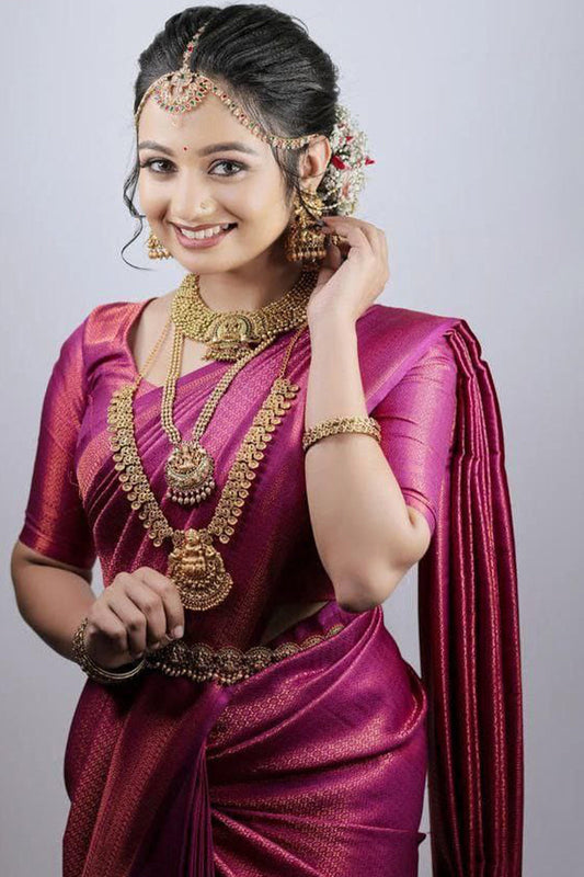 Girlish Dark Pink Kanjivaram Silk Saree With Intricate Blouse Piece