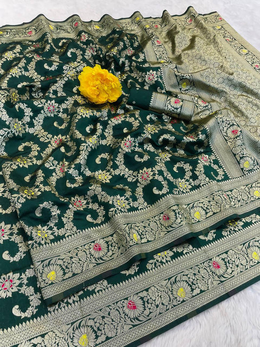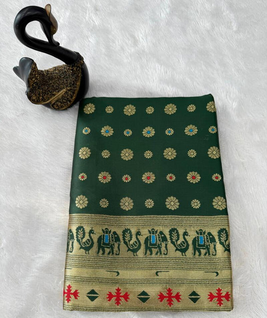 Blooming Dark Green Soft Banarasi Silk Saree With Captivating Blouse Piece