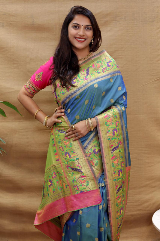 Magnetic Sky Paithani Silk Saree With Fantabulous Blouse Piece