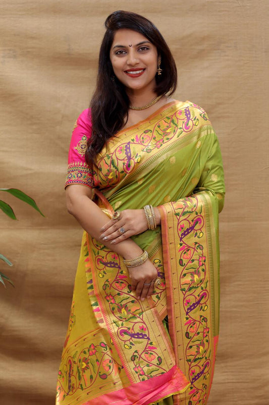 Serendipity Pista Paithani Silk Saree With Snazzy Blouse Piece