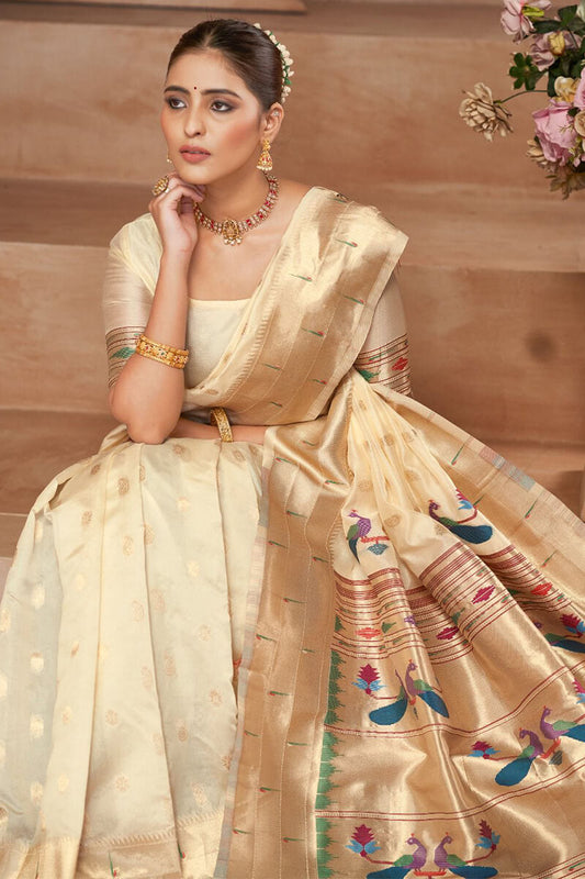 Intricate Beige Paithani Silk Saree With Smart Blouse Piece
