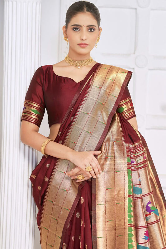 Invaluable Maroon Paithani Silk Saree With Wonderful Blouse Piece