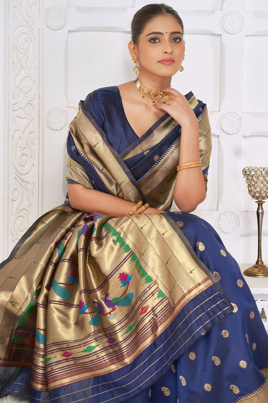 Pretty Navy Blue Paithani Silk Saree With Amazing Blouse Piece