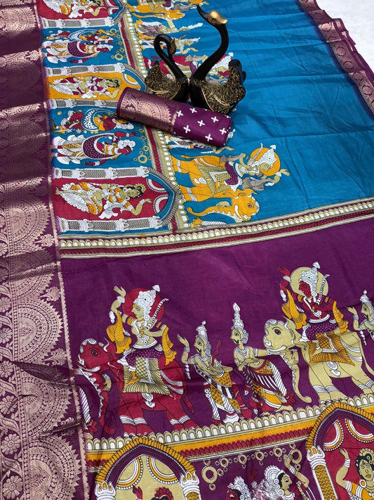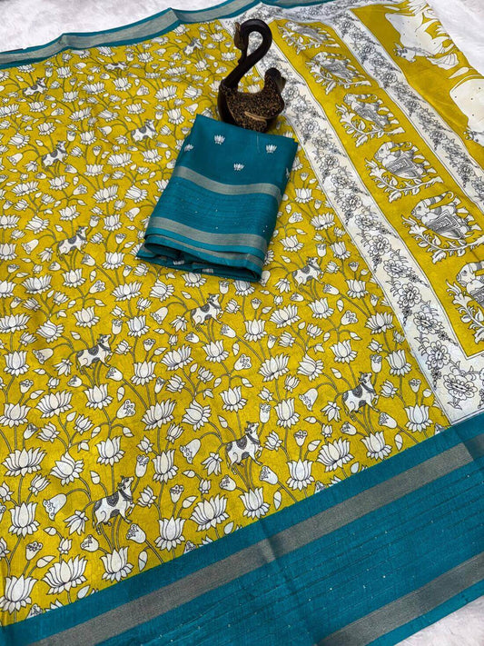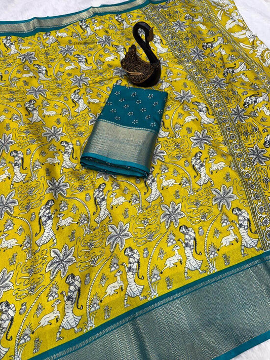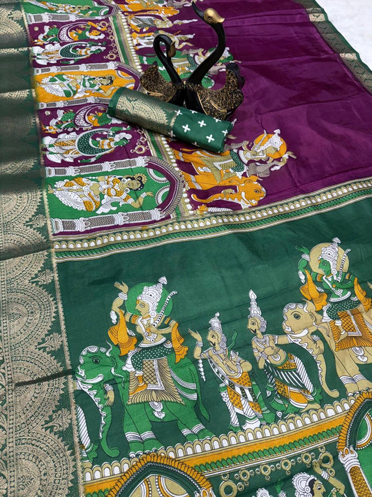 Lissome Mehndi Kalamkari Printed Saree With Desuetude Blouse Piece