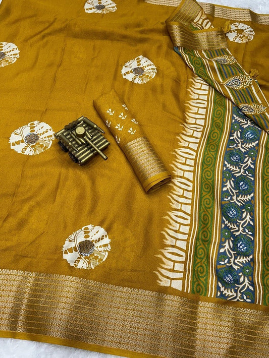 Elision Mustard Digital Printed Dola Silk Saree With Moiety Blouse Piece