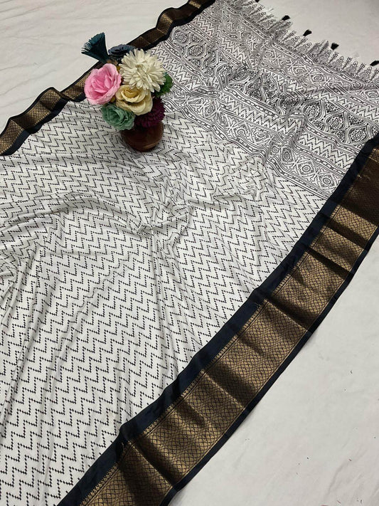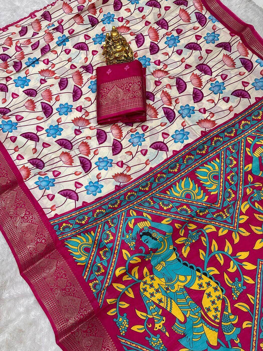 Magnificat Off White Digital Printed Dola Silk Saree With Glowing Blouse Piece