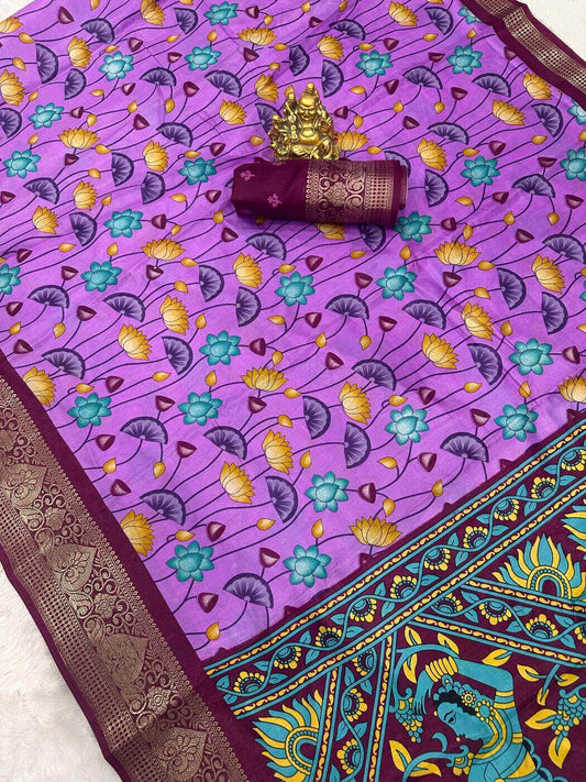 Glowing Lavender Digital Printed Dola Silk Saree With Incredible Blouse Piece