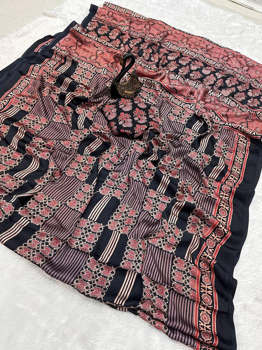 Evocative Black Ajrakh Printed Gajji Soft Silk Saree With Posh Blouse Piece