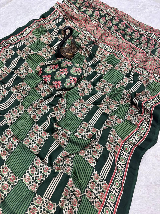 Exemplary Dark Green Ajrakh Printed Gajji Soft Silk Saree With Fragrant Blouse Piece