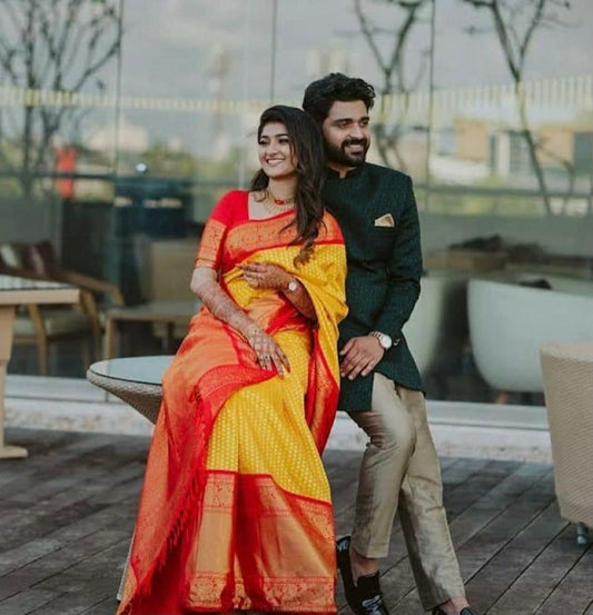 Groovy Yellow Soft Banarasi Silk Saree With Angelic Blouse Piece