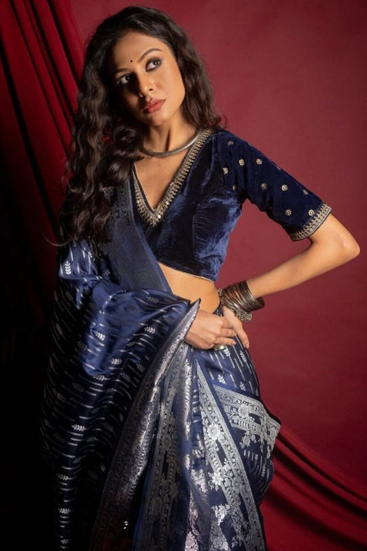 Precious Navy Blue Soft Silk Saree With Innovative Blouse Piece