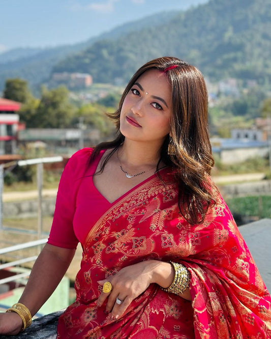 Fairytale Red Soft Silk Saree With Ailurophile Blouse Piece