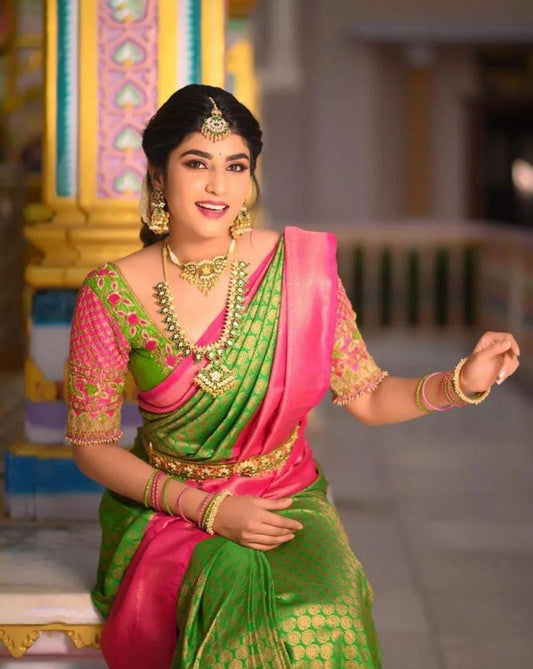 Fantabulous Rama Soft Silk Saree With Arresting Blouse Piece
