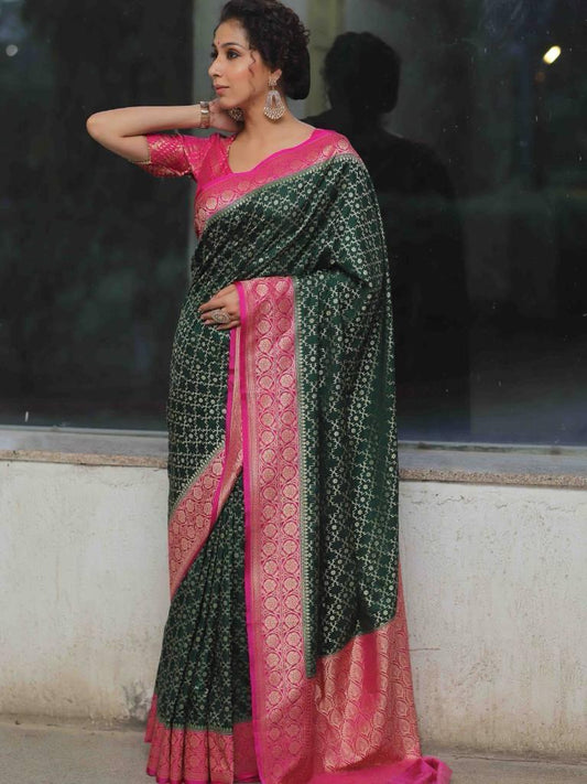 Excellent Dark Green Soft Banarasi Silk Saree With Rhapsodic Blouse Piece