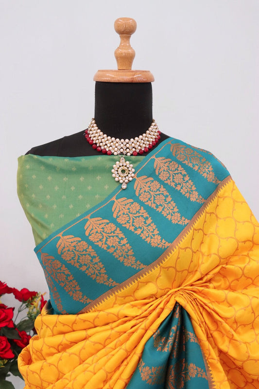 Snappy Yellow Soft Banarasi Silk Saree With Supernal Blouse Piece