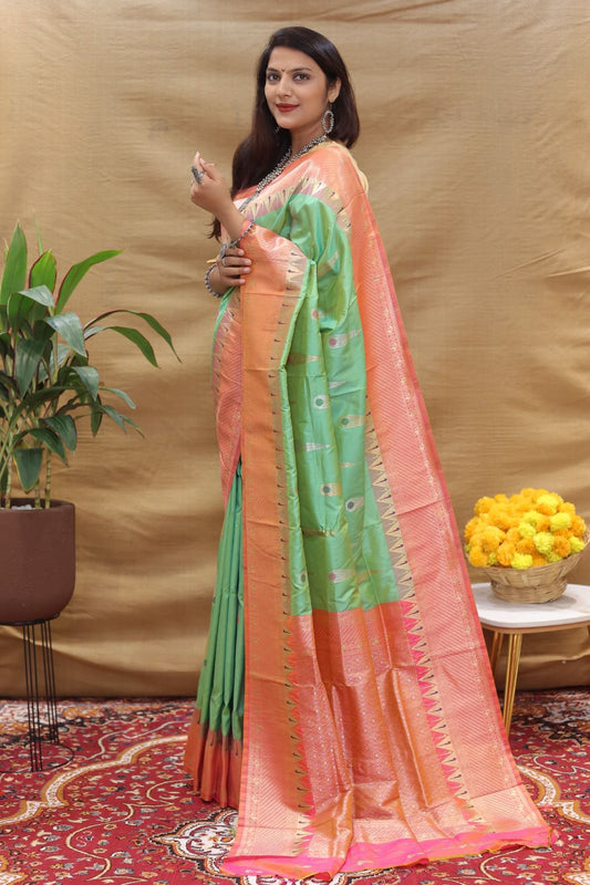 Gossamer Green Paithani Silk Saree With Mellifluous Blouse Piece