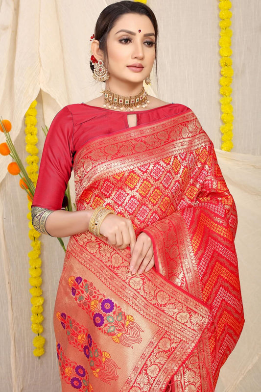 Extraordinary Red Soft Banarasi Silk Saree With Skinny Blouse Piece