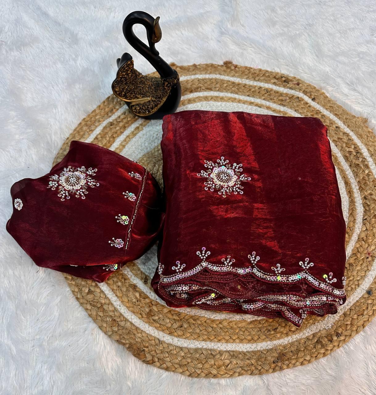 Amazing Maroon Sequence Work Fandy Silk Saree With Entrancing Blouse Piece