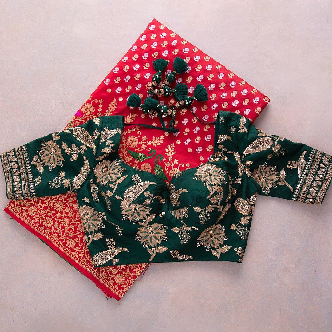 Be an angel and create and establish a smashing influence on everybody by carrying this traditional Banarasi saree. This saree is crafted by skilled weaver of Banaras with elegance and grace, this saree is definitely the epitome of beauty and a must have in your collection. Style it with your best pair of heels, gold or Moti necklace and a potli bag for the perfect look.
