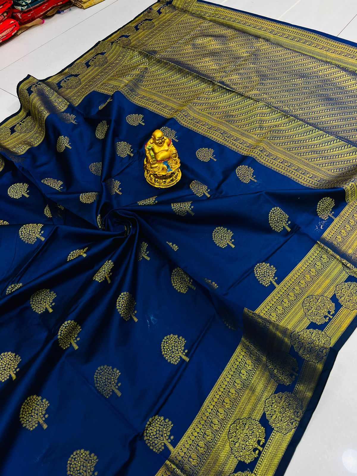Dazzling Navy Blue Soft Banarasi Silk Saree With Supernal Blouse Piece