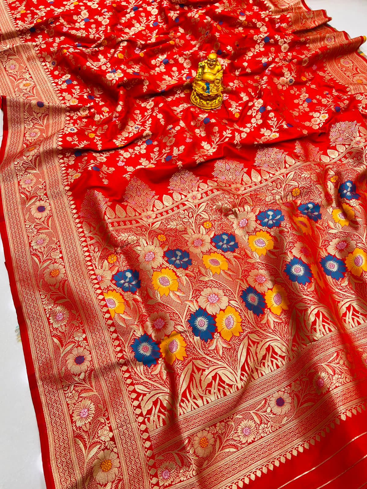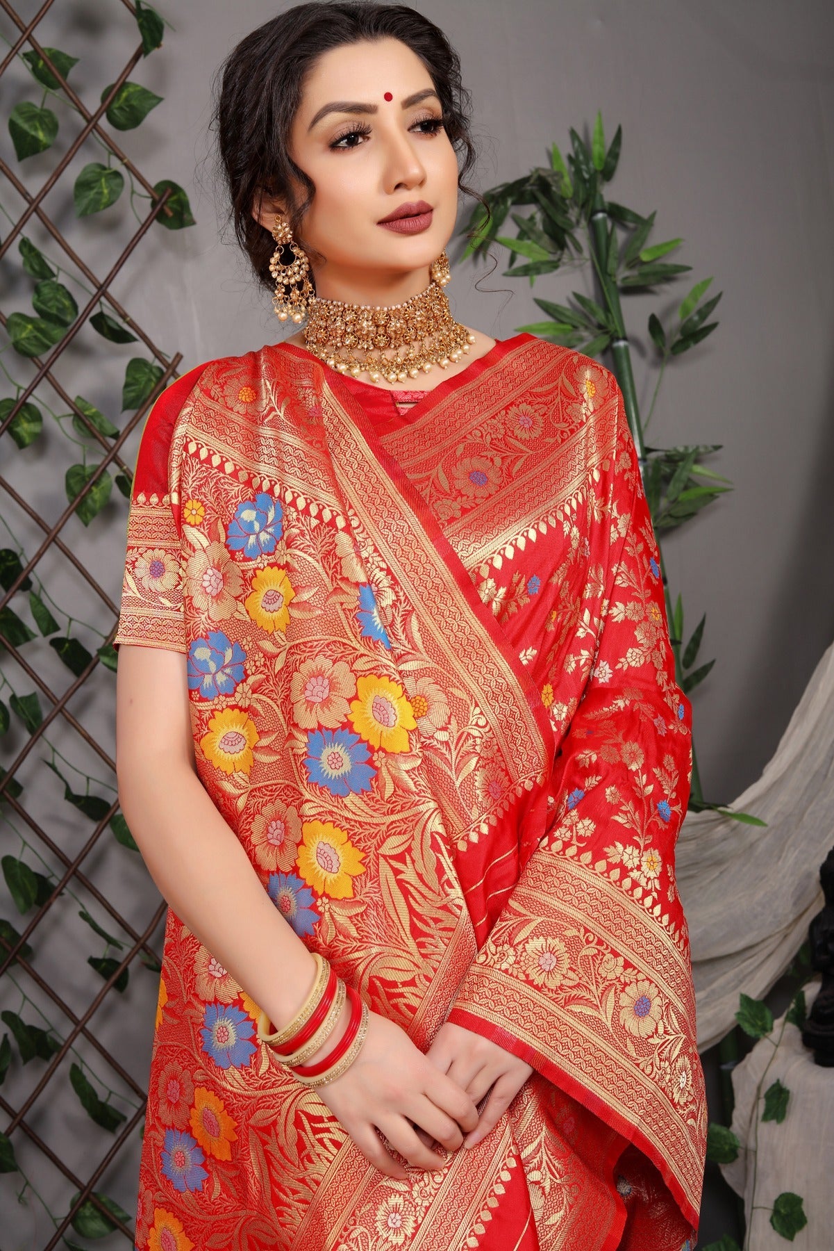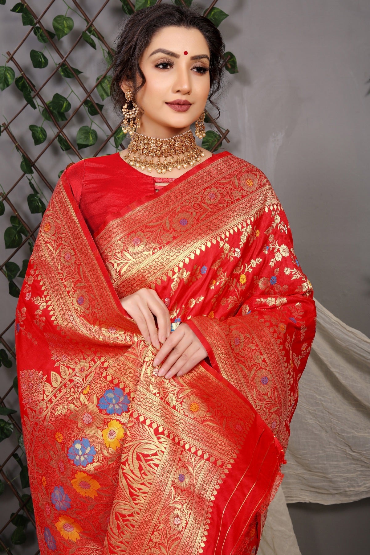 Denouement Red Banarasi Silk Saree With Skinny Blouse Piece