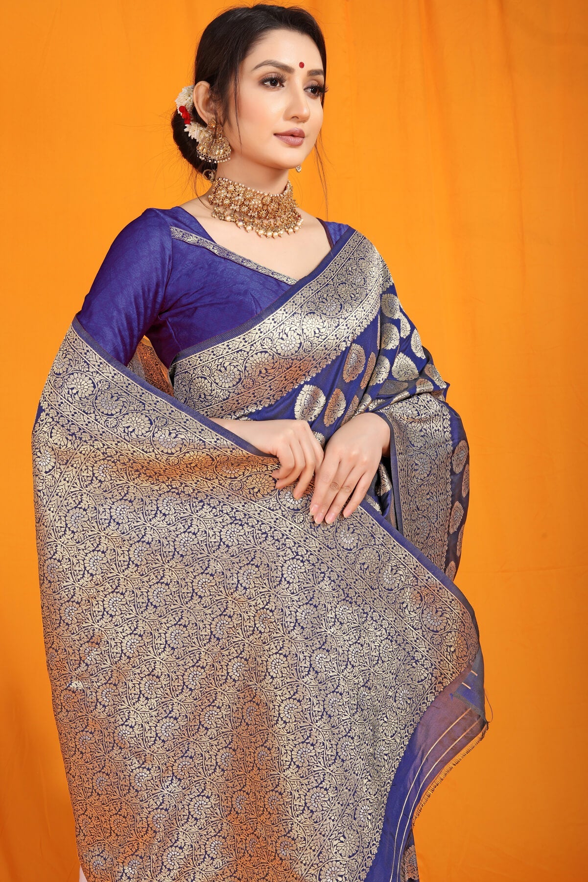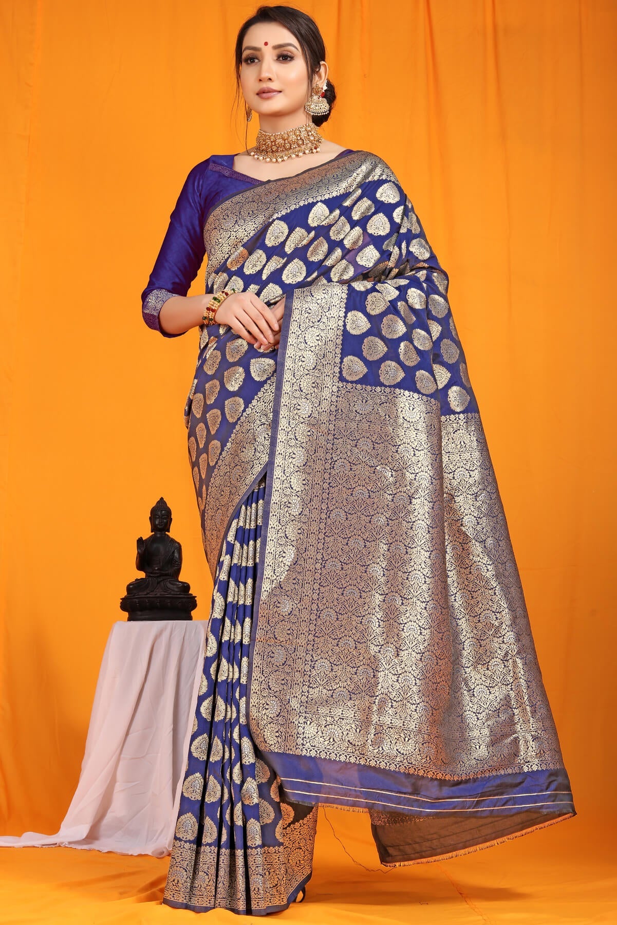 Deserving Navy Blue Banarasi Silk Saree With Divine Blouse Piece