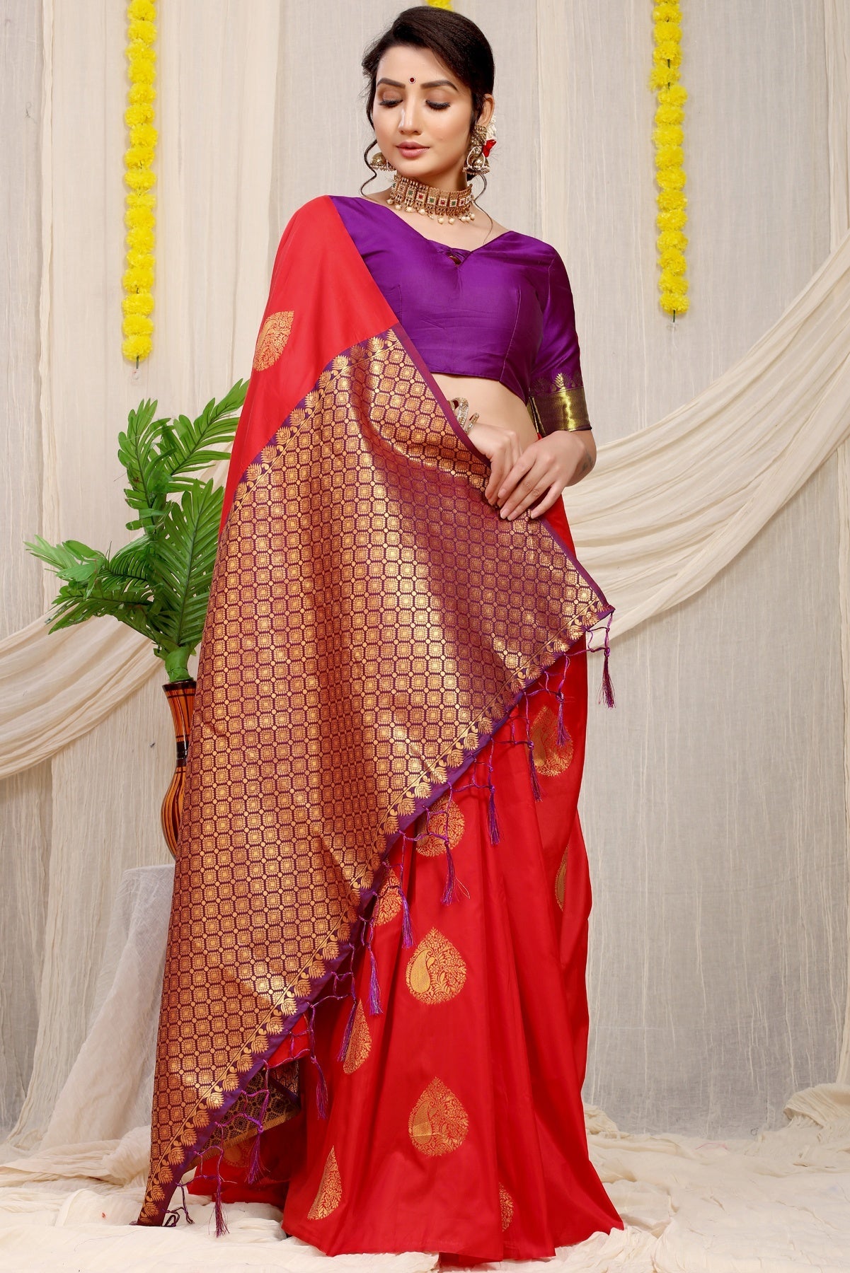 Deserving Red Banarasi Silk Saree With Engrossing Blouse Piece