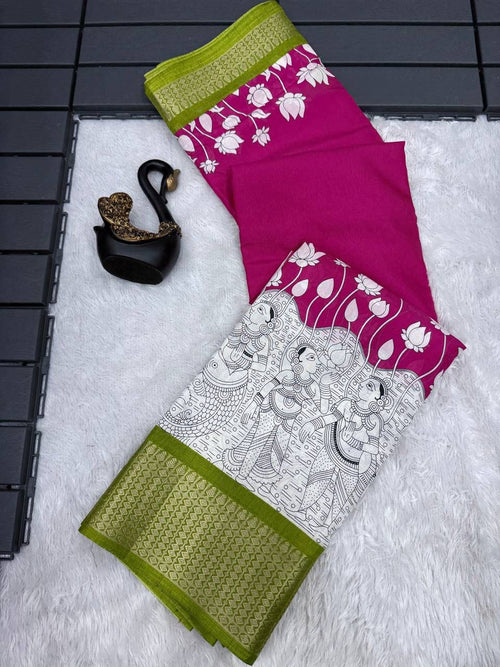 Elision Dark Pink Digital Printed Dola Silk Saree With Snazzy Blouse Piece