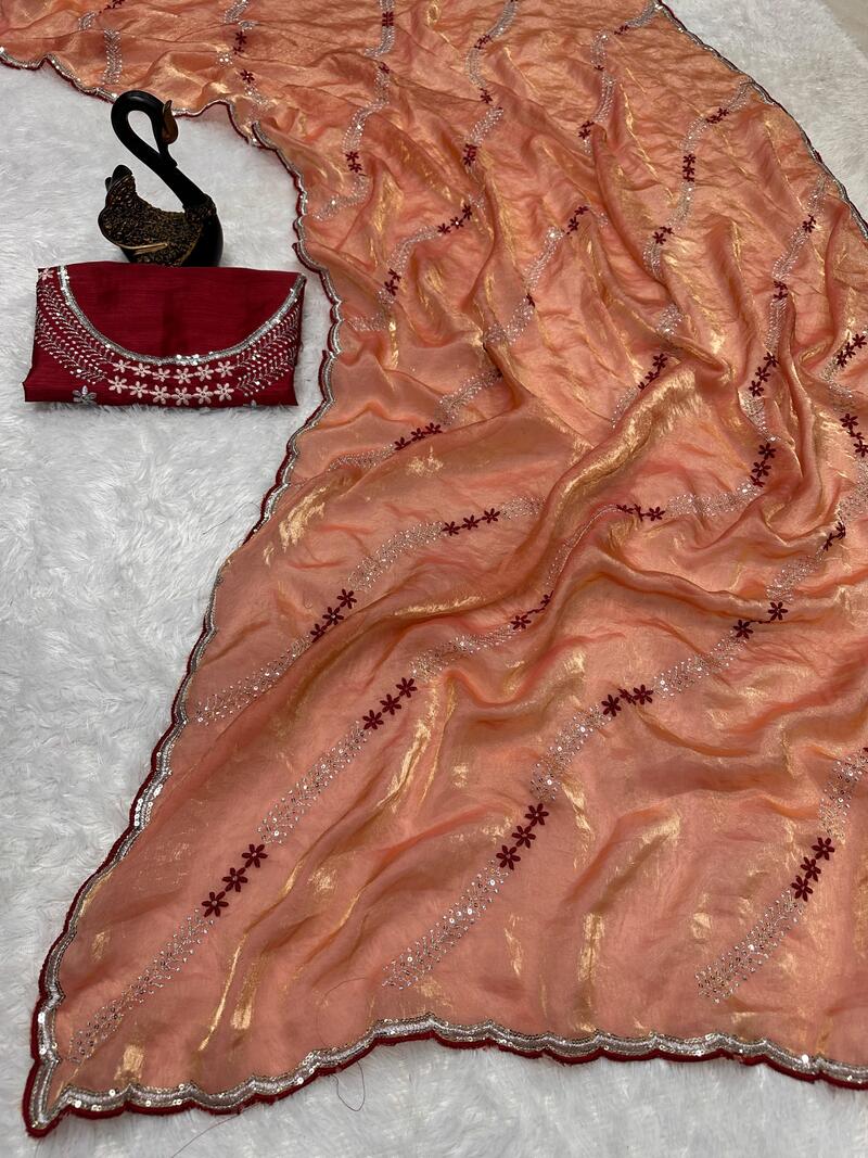 Embrocation Orange Sequence Work Fandy Silk Saree With Gratifying Blouse Piece