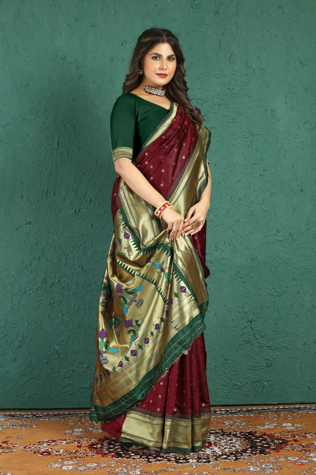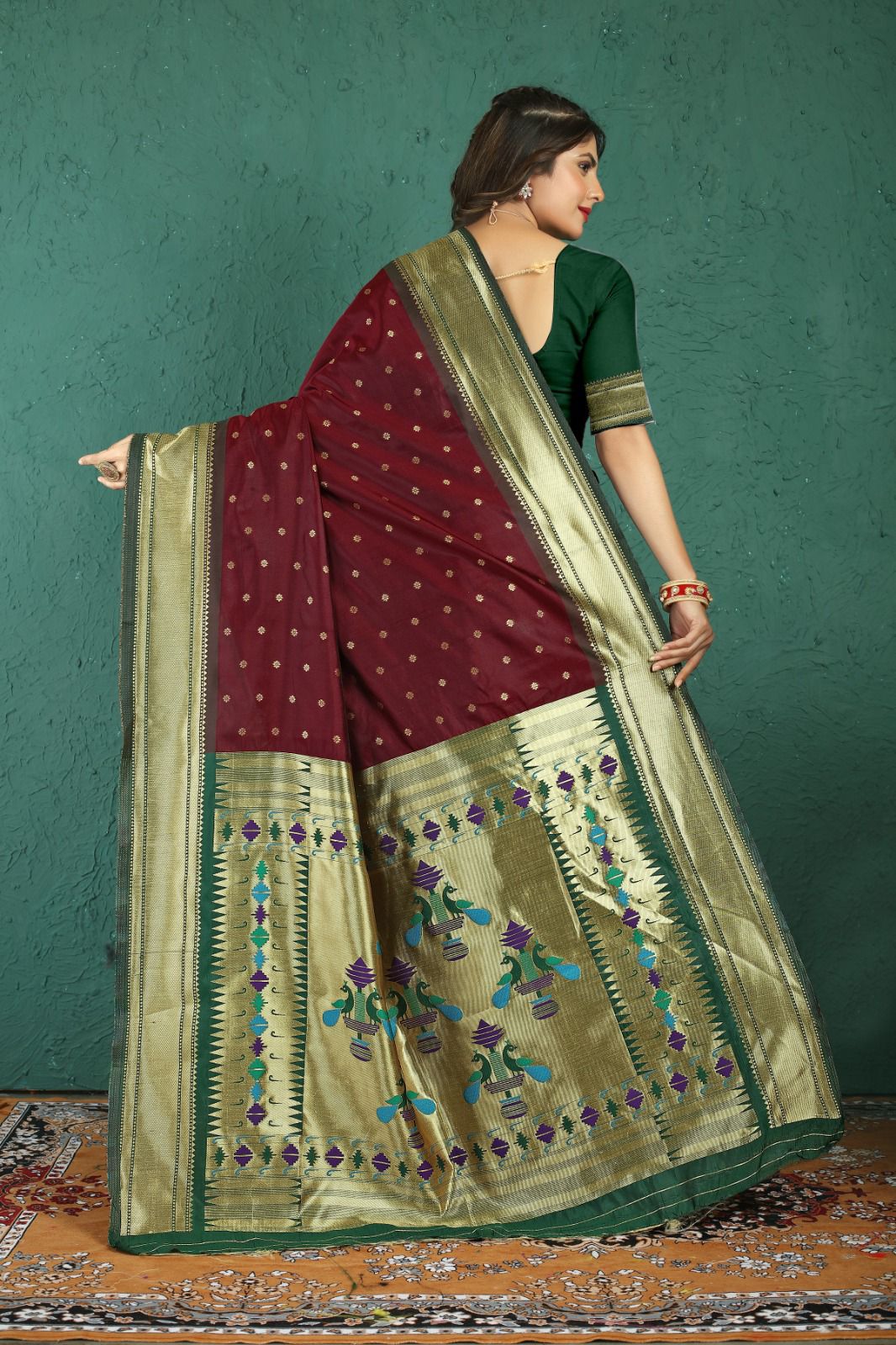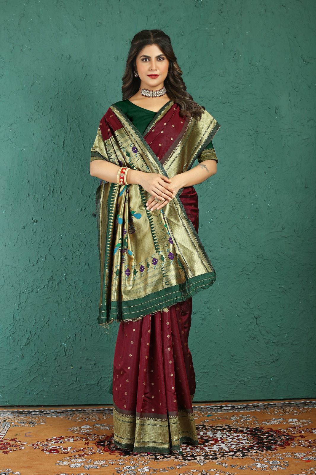 Engrossing Wine Paithani Silk Saree With Jazzy Blouse Piece