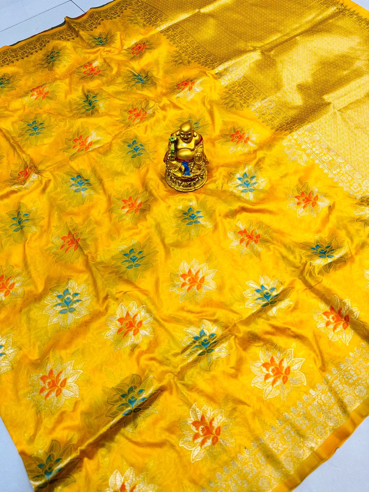 Ethnic Yellow Banarasi Silk Saree With Traditional Blouse Piece
