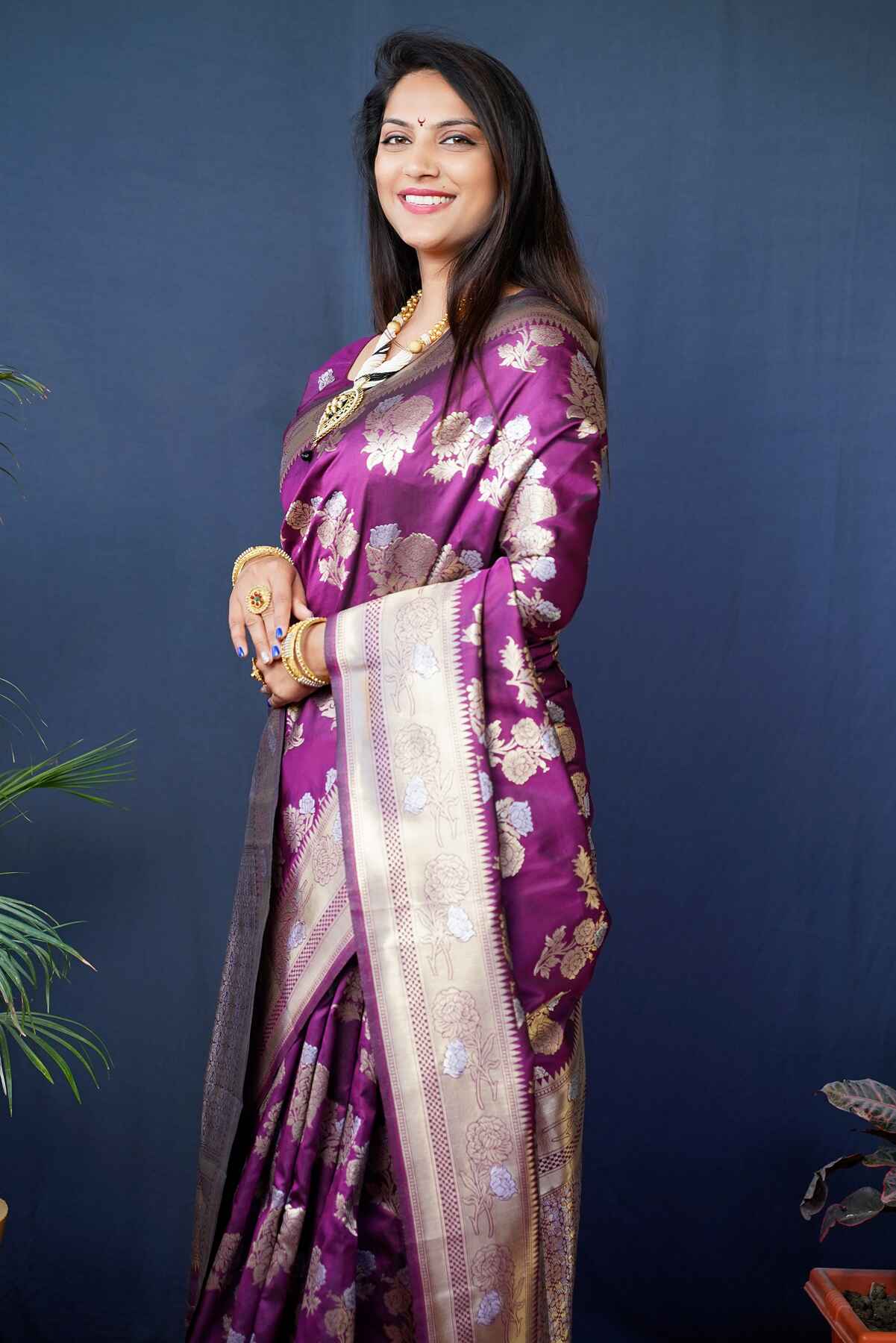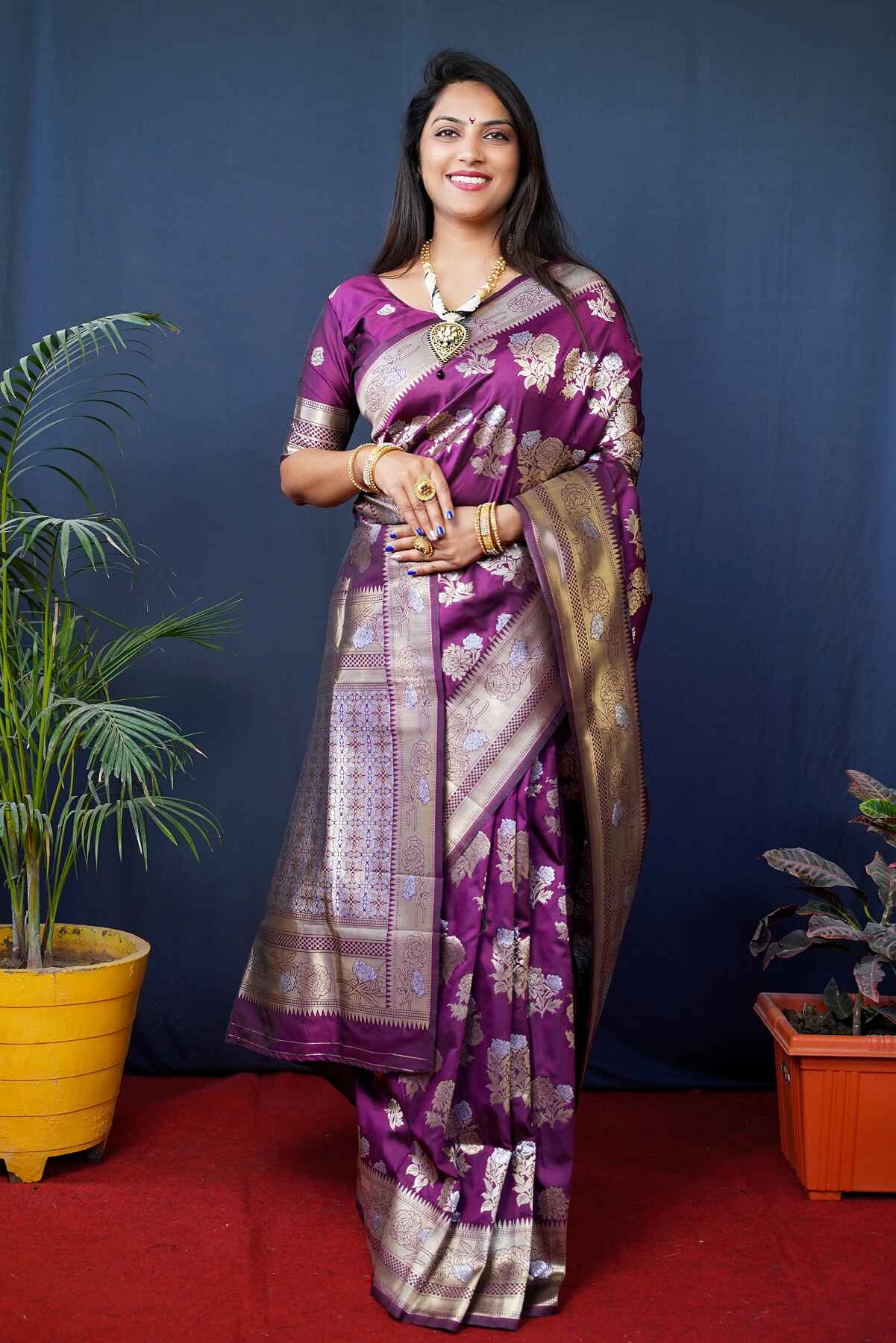 Exquisite Purple Kanjivaram Silk Saree With Glittering Blouse Piece