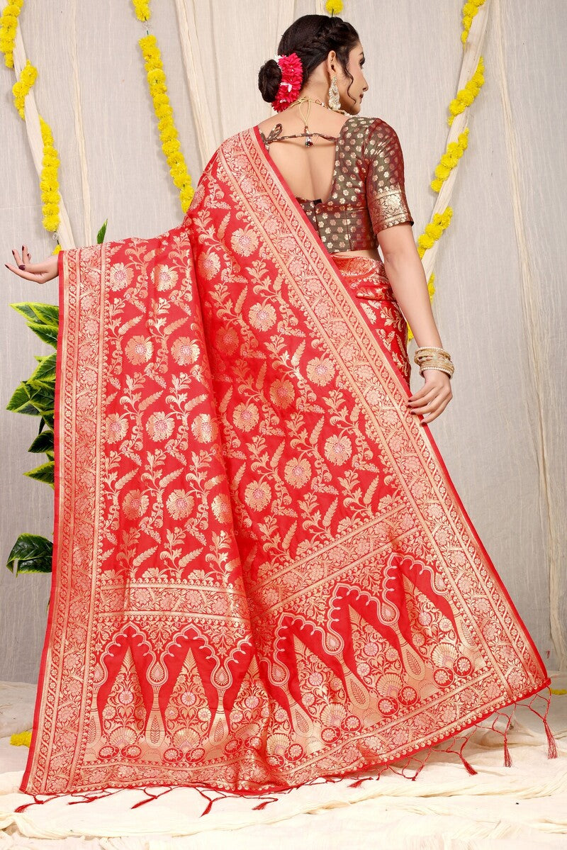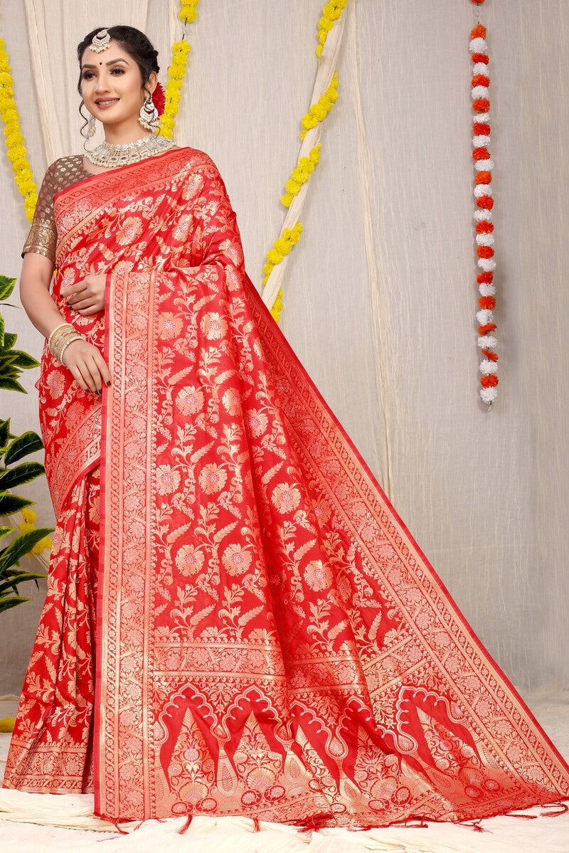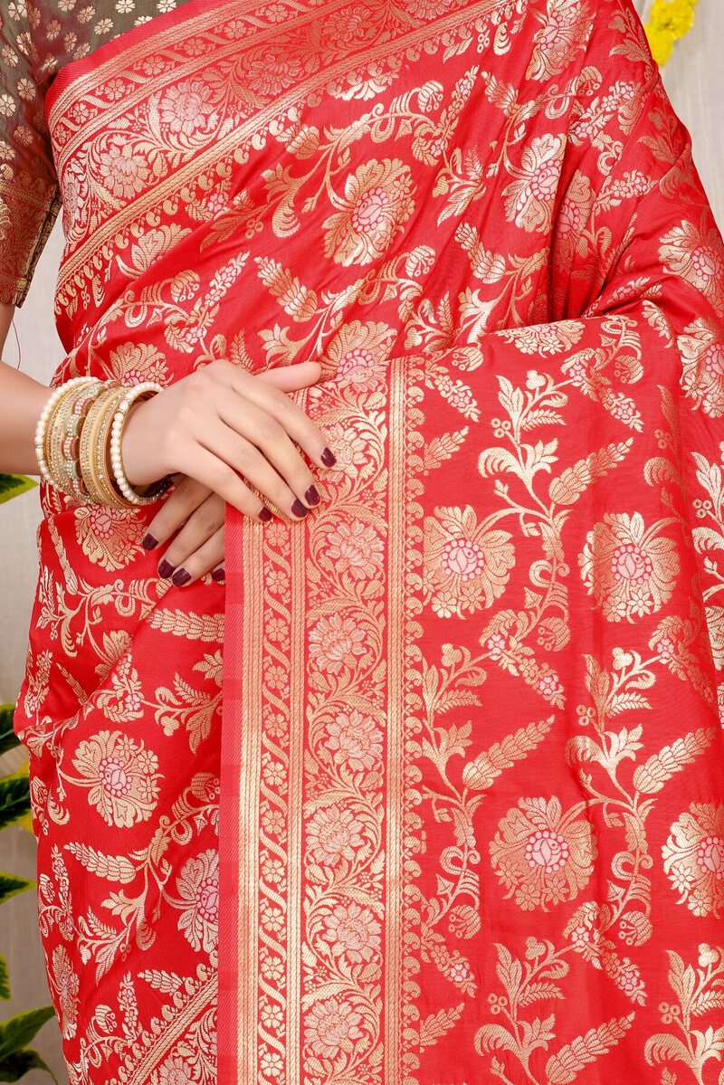 Eye-catching Red Soft Banarasi Silk Saree With Nemesis Blouse Piece