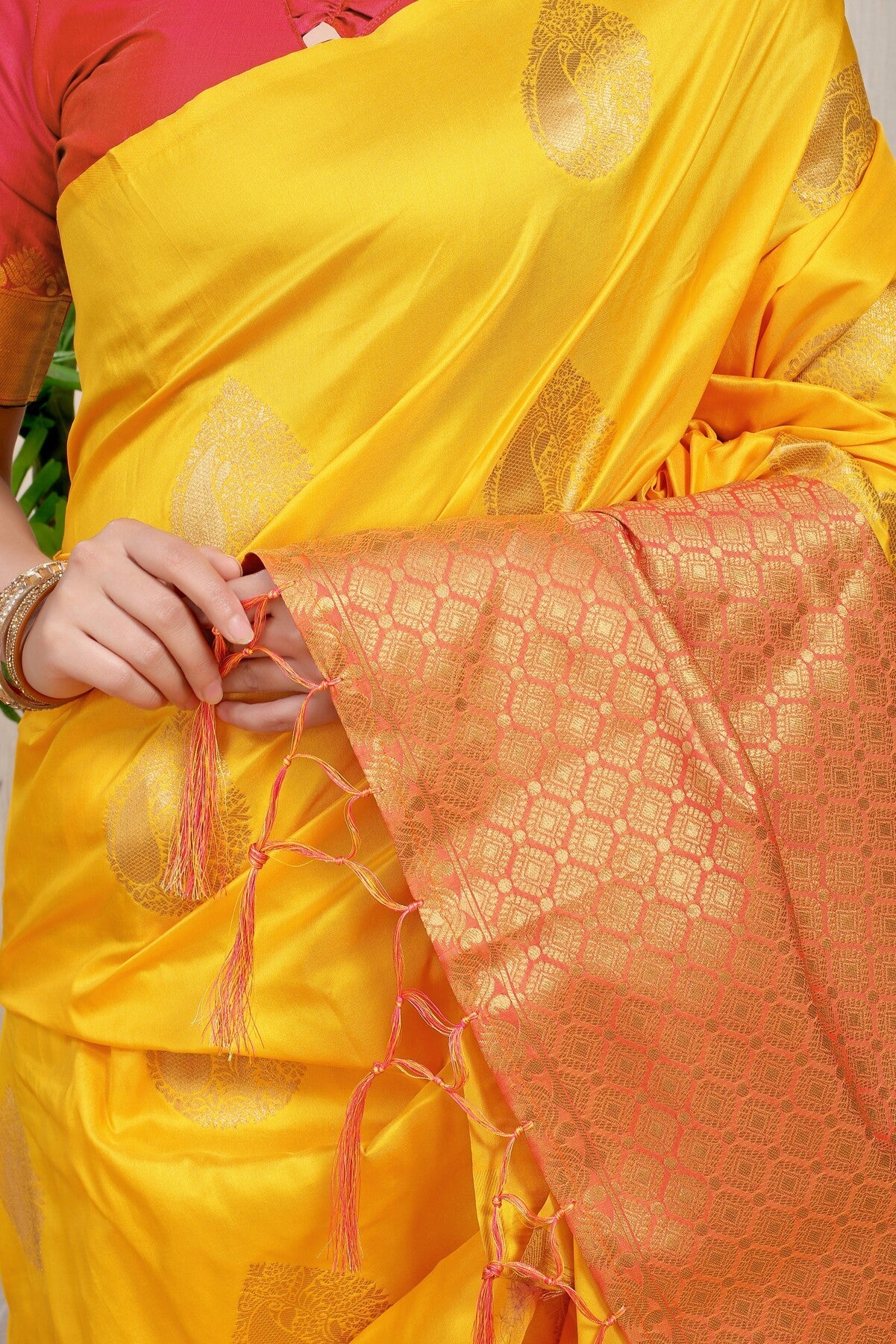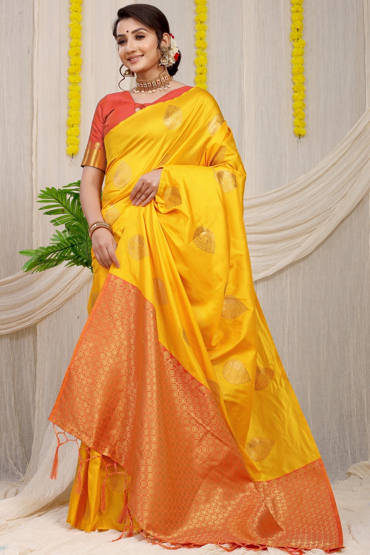 Eye-catching Yellow Banarasi Silk Saree With Engrossing Blouse Piece