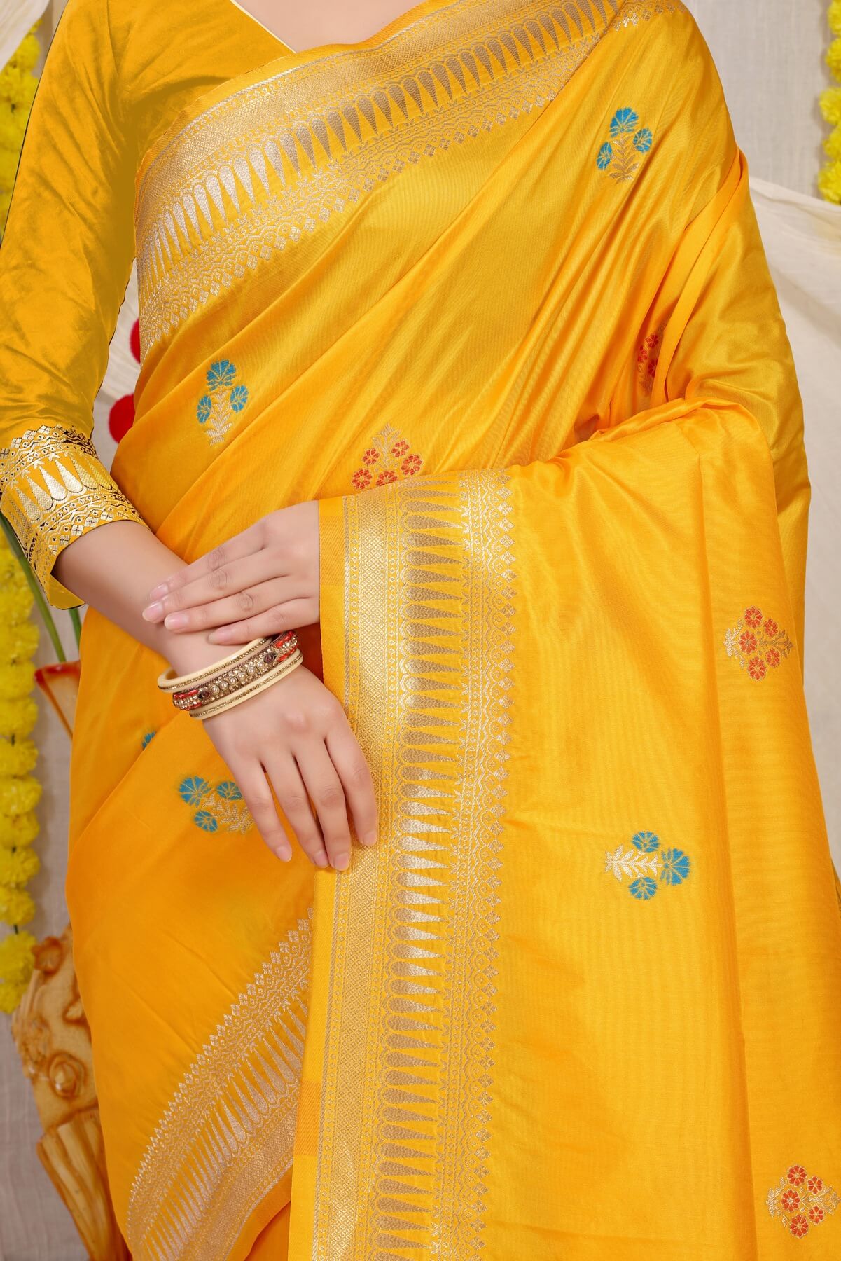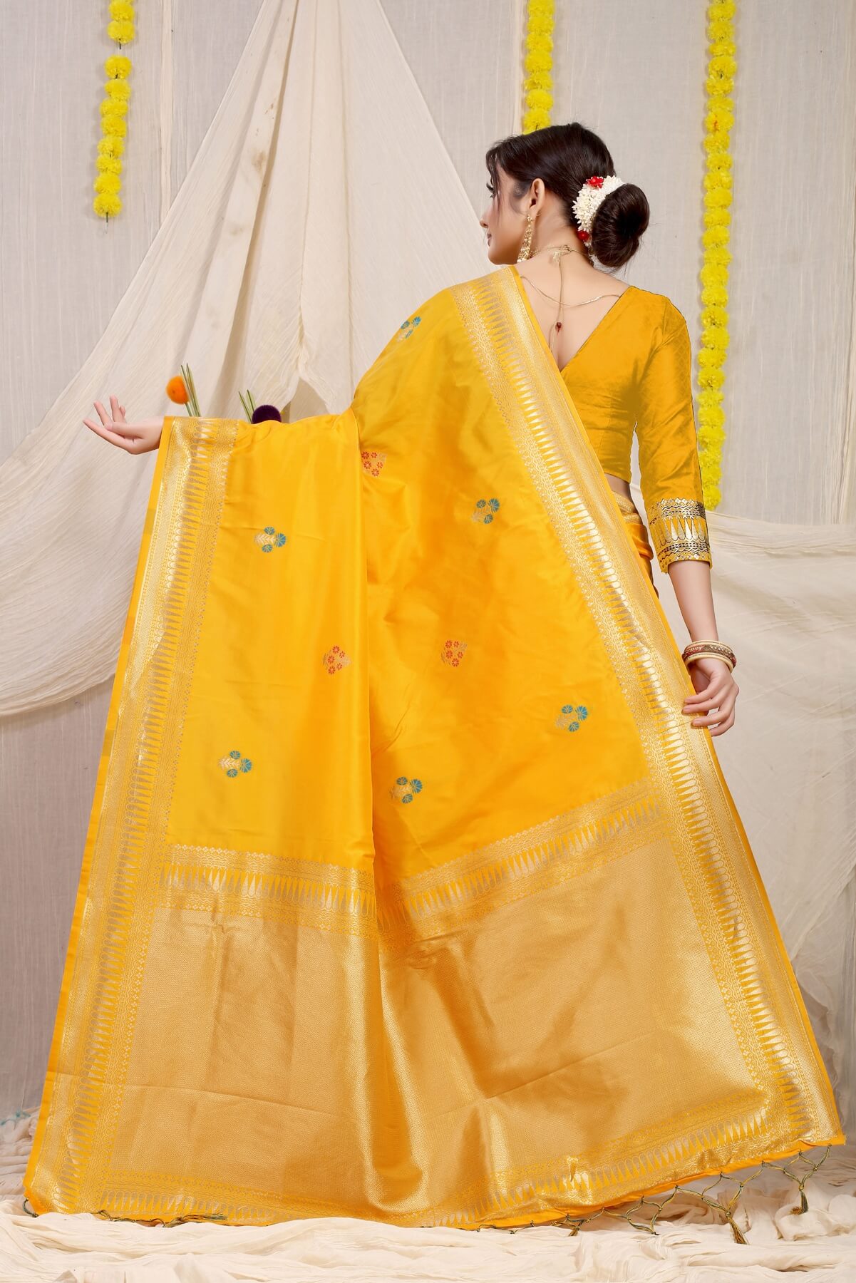 Flameboyant Yellow Banarasi Silk Saree With Magnetic Blouse Piece