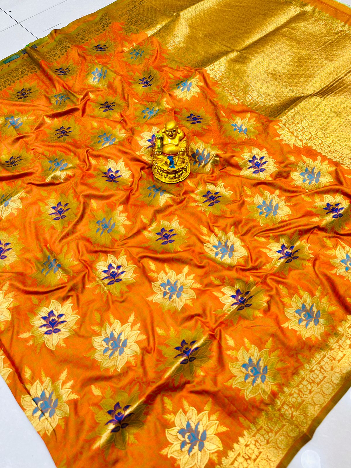 Girlish Orange Banarasi Silk Saree With Comely Blouse Piece