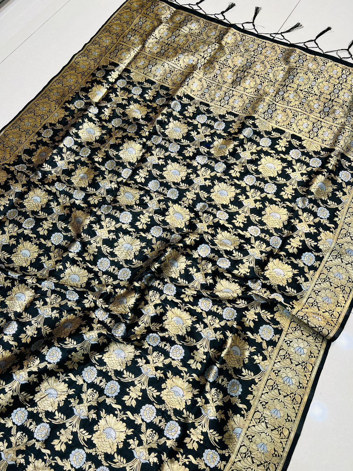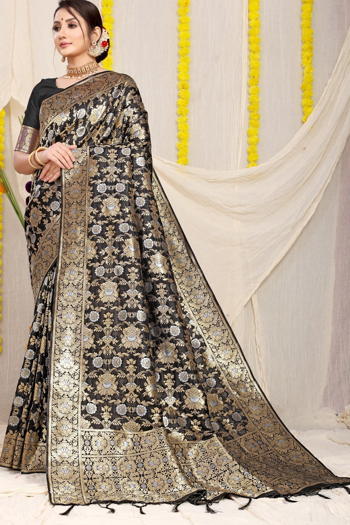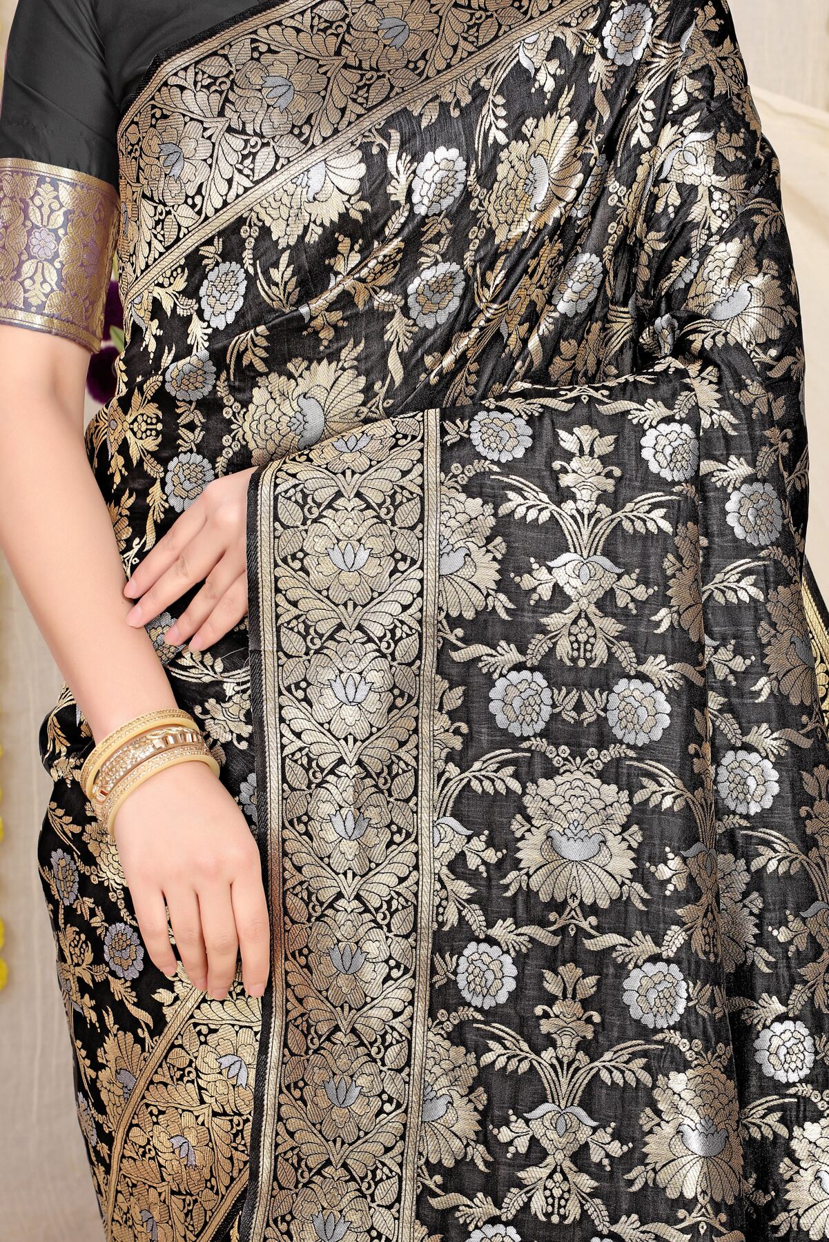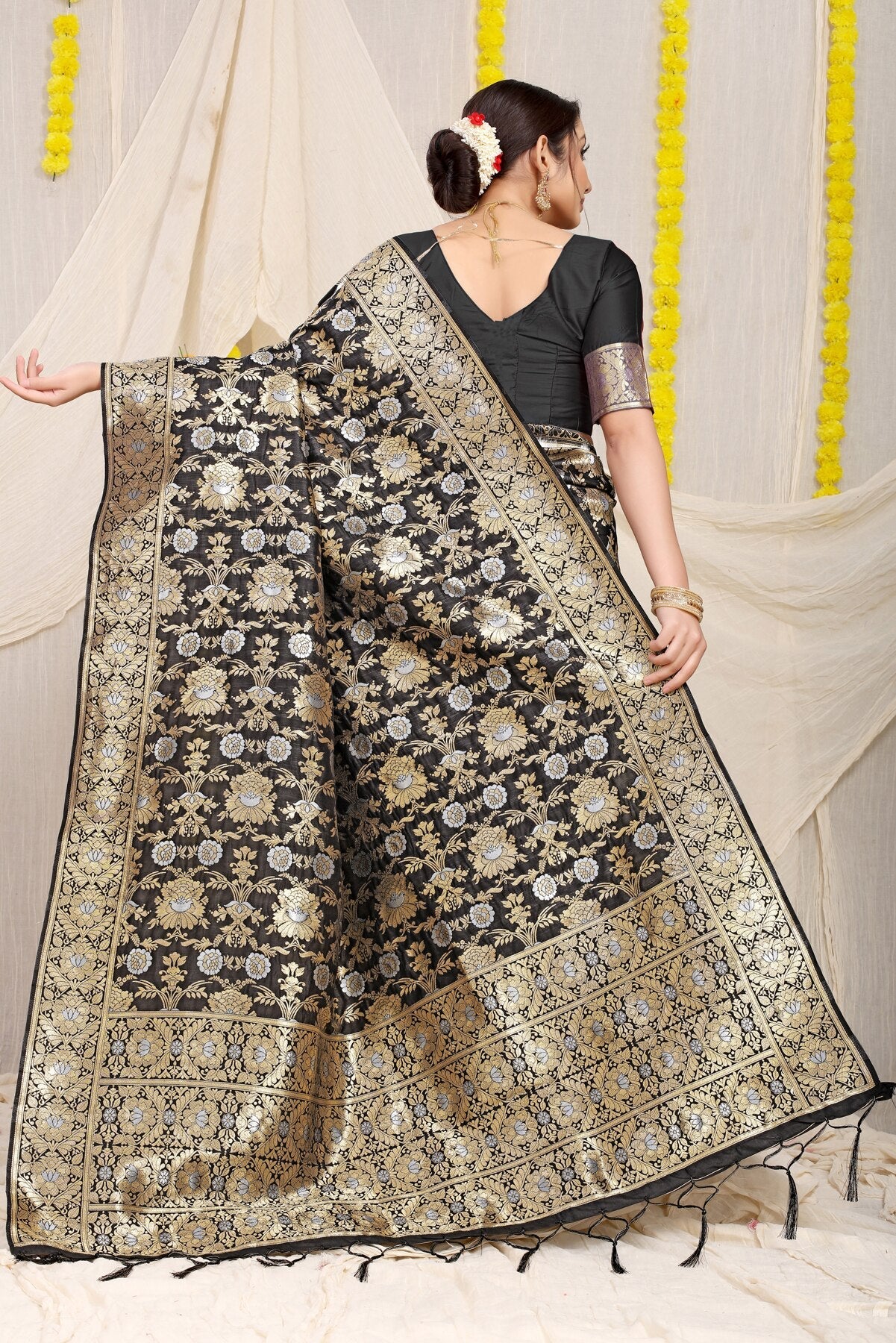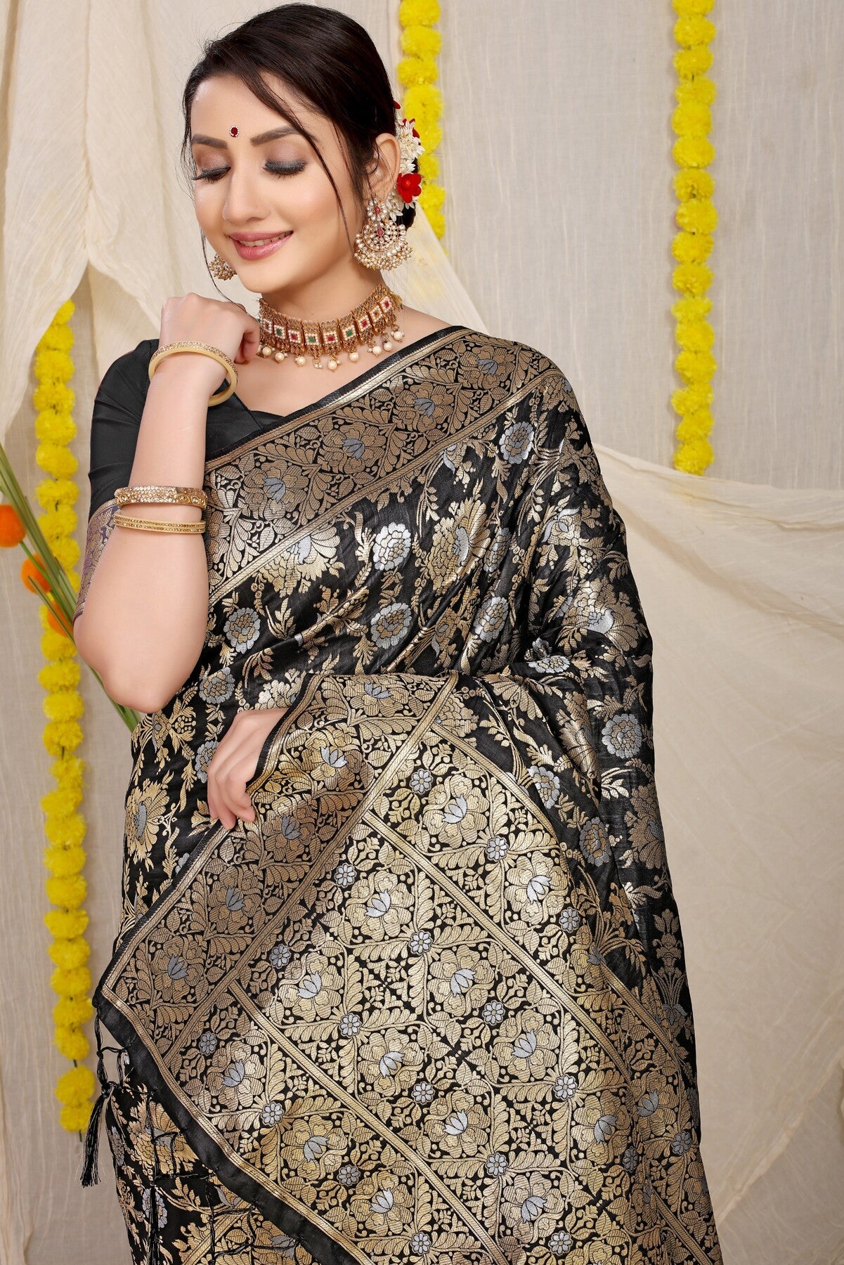 Gleaming Black Banarasi Silk Saree With Fairytale Blouse Piece
