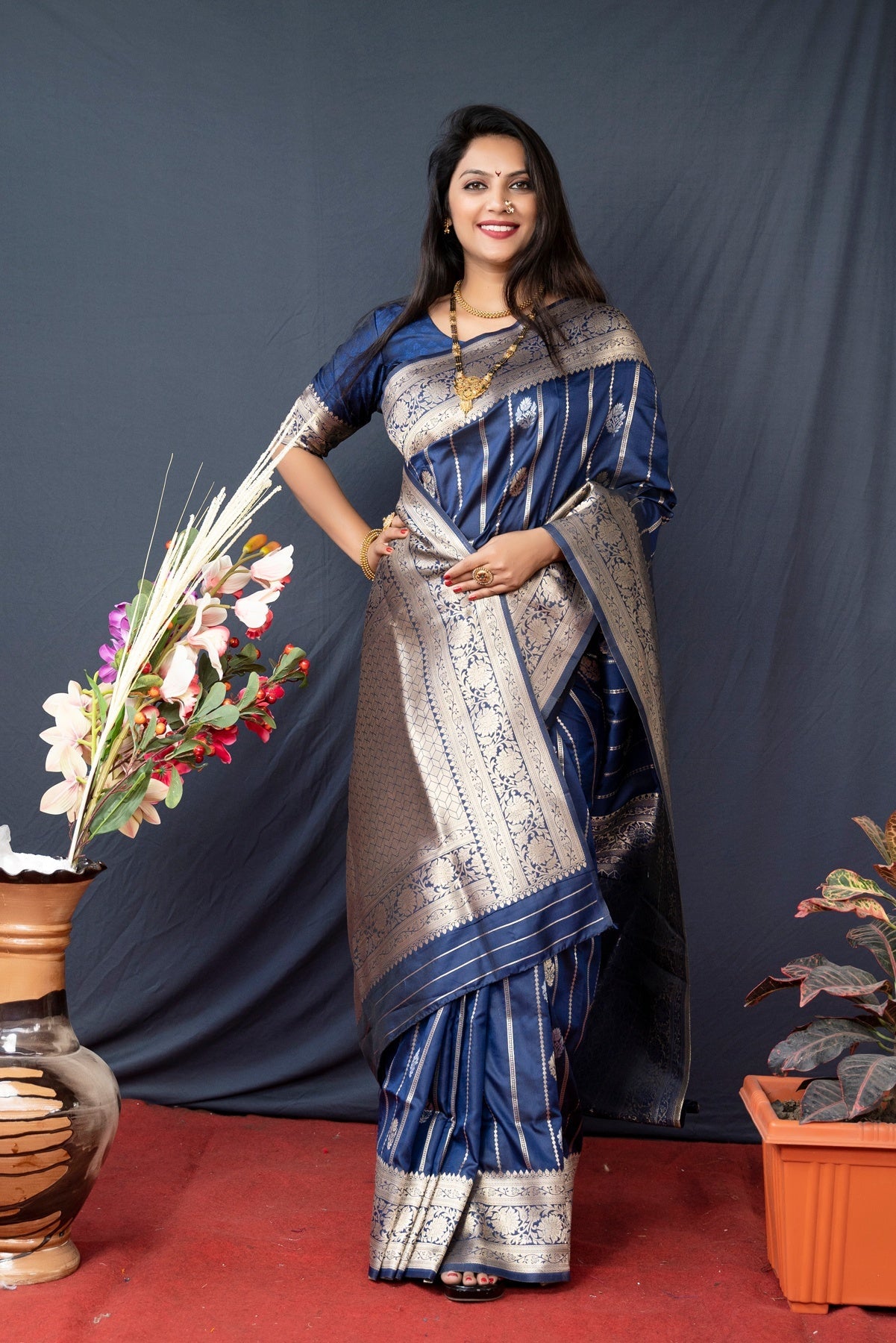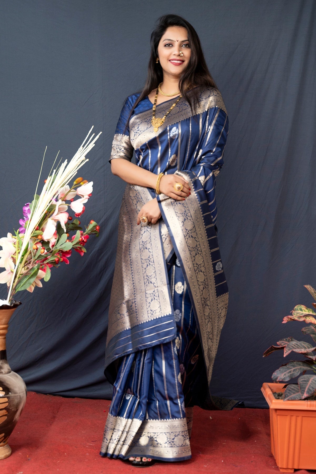 Gleaming Navy Blue Banarasi Silk Saree With Pretty Blouse Piece