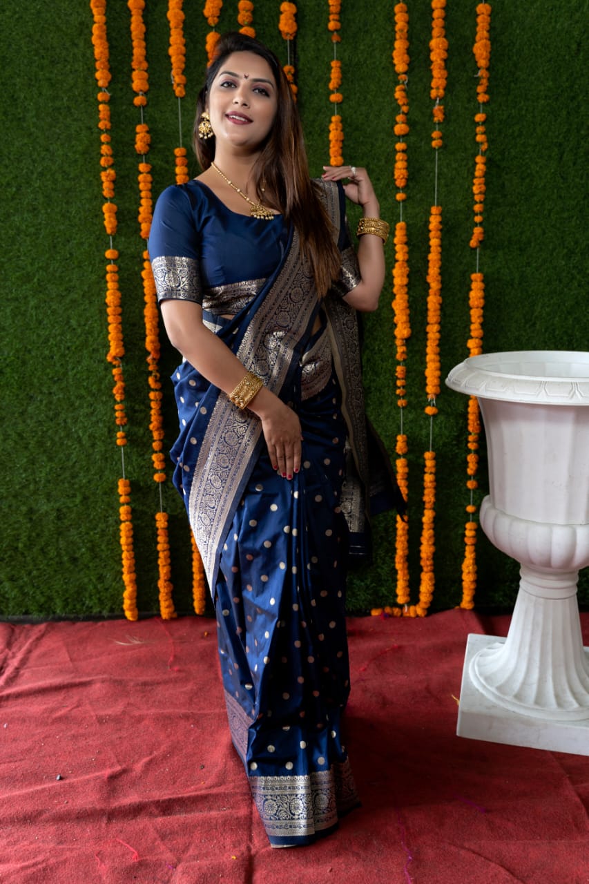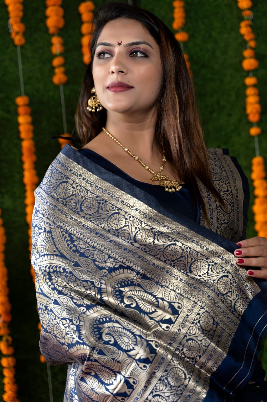 Glittering Blue Banarasi Silk Saree With Most Traditional Blouse Piece