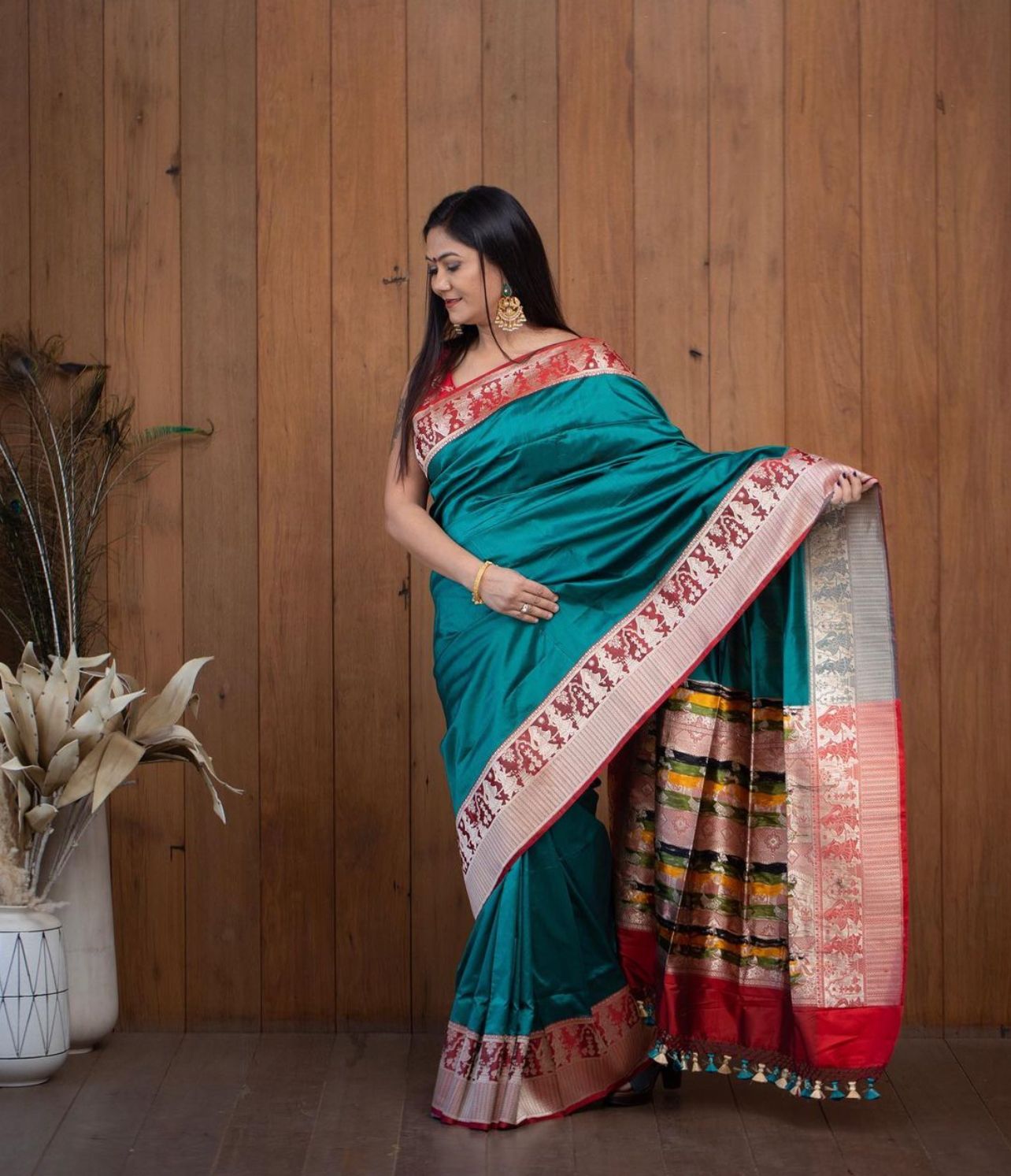 Glorious Rama Paithani Silk Saree With Ethnic Blouse Piece
