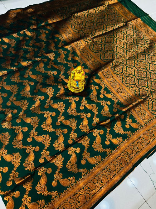 Glowing Dark Green Soft Banarasi Silk Saree With Beautiful Blouse Piece