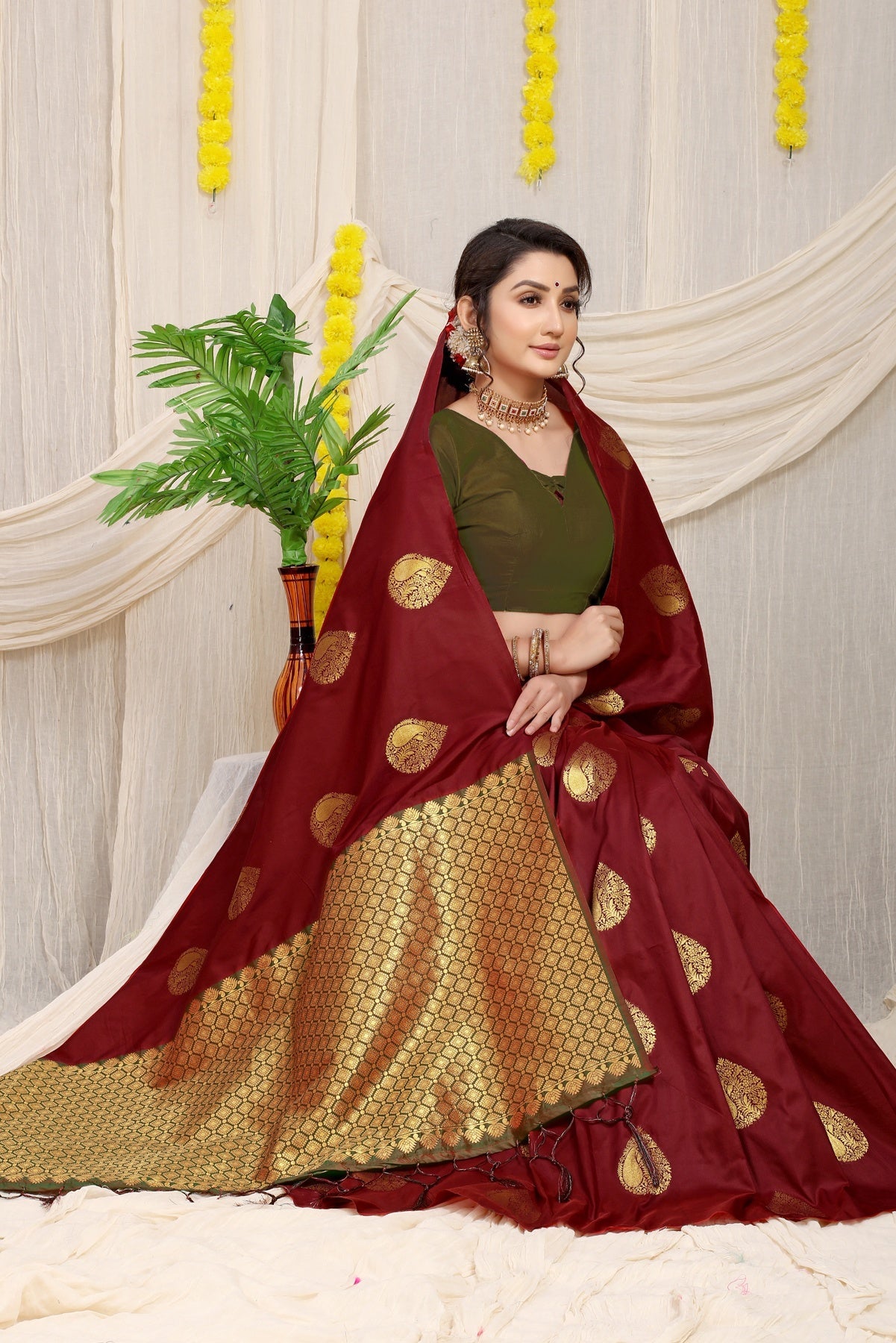 Glowing Wine Banarasi Silk Saree With Engrossing Blouse Piece
